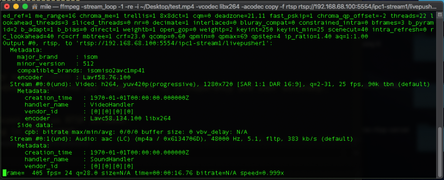 G5:~ itvd$ ffmpeg -stream_loop -1 -re -i /Users/mile/Desktop/test.mp4 -vcodec libx264 -acodec copy -f rtsp rtsp://192.168.68.100:5554/ipc1-stream1/livepusher1